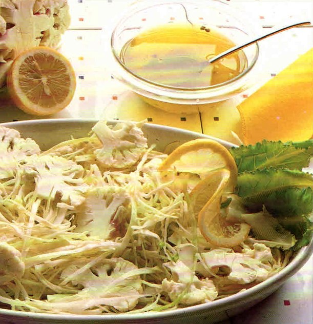 Scegliete le cime più tenere del cavolfiore, lavatele, asciugatele e tagliatele a fettine sottili. Disponetele in un’insalatiera e aggiungete le listarelle di cavolo verza che avrete scolato bene passandole nella centrifuga per l’insalata.