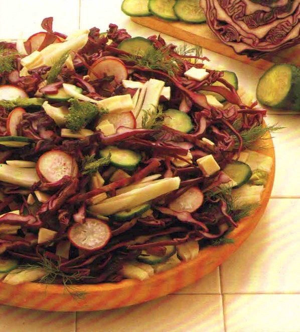 Lavate e asciugate i finocchi, tagliateli a spicchi e poi a fettine. Aggiungeteli al cavolo rosso insieme al formaggio tagliato a pezzetti.