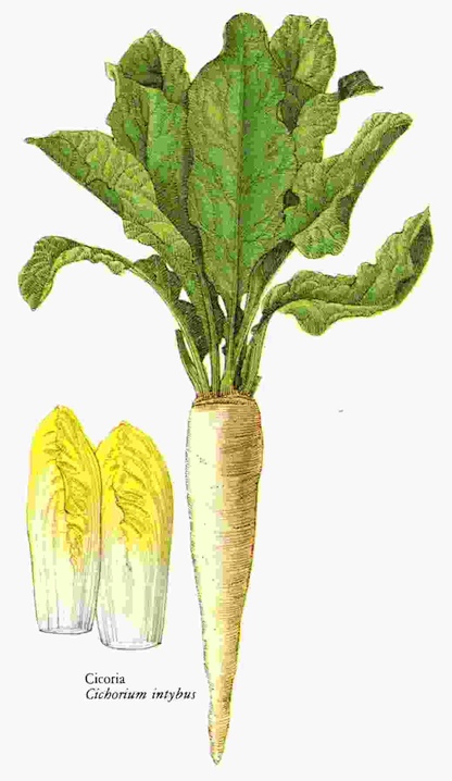 Questa pianta ha avuto commercio con la magia, e ha generato una quantità di leggende. Nel suo “Dry Dinner” del 1599 Dyett dice che “è stata ed è ancora oggi una pianta cui la superstizione attribuisce il potere di far ottenere il favore dei potenti a chiunque unga il proprio corpo col suo succo“. Cresce selvatica in molti Paesi, possiede una gran varietà di nomi dialettali e locali. Molti scrittori antichi trattano la cicoria e l’indivia insieme, perché queste due composite hanno molte caratteristiche in comune. Sappiamo da Orazio che la cicoria veniva usata ai suoi tempi; Plinio, Virgilio e Columella ci parlano dell’indivia. Essendo imparentata con la famiglia della lattuga e del tarassaco, la cicoria ha una punta d’amaro – un amaro che puo venir mitigato dall’imbianchimento, perché quanto più verdi sono le foglie, tanto più saranno amare. Tutte e due sono utilissime per le insalate invernali, quando mancano quasi tutte le altre verdure. La cicoria si presta ad esser forzata, e all’imbianchimento, in un luogo scuro, quando tutto il resto è sotto la neve. Produrrà dei getti bianchi. Staccateli delicatamente quando ne avete bisogno e otterrete un nuovo raccolto. Usateli subito: esposti alla luce, appassiscono nel giro di un’ora.