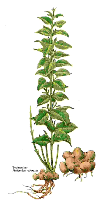 Questa verdura ha in Inghilterra un nome: Carciofo di Gerusalemme, che è un grosso equivoco perché ha pochissimo a che fare con un carciofo e niente con Gerusalemme. Questo girasole con le radici tuberose fu chiamato carciofo perche i primi coloni europei in America ritenevano che i tuberi avessero il sapore dei veri carciofi, e di Gerusalemme perché gli italiani chiamavano “girasoli” i fiori che si giravano verso il sole, e il nome fu malinteso dagli Inglesi per Gerusalemme. Il topinambur è tanto simile al girasole che è quasi la medesima pianta; la differenza e costituita dal fatto che i fiori del primo e i noduli radicali del secondo sono rispettivamente più piccoli. Le radici del topinambur in realtà non hanno il sapore dei carciofi, tuttavia non si può essere d’accordo con John Goodyer, citato nello Herball di Gerard, che “in qualunque modo siano preparati sono cibo più adatto al maiale che all’uomo”. Lovelock ci dice che quando la pianta fu introdotta in Inghilterra nel 1616, attraverso la Francia e il Canada, dove cresceva allo stato selvatico, veniva usata per confettura, ma l’abuso che ne fecero i pasticceri le fece perdere popolarità. La radice contiene inulina, una sostanza che lo rende indigesto, ma il suo aroma particolare può essere delizioso.