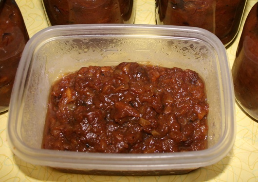 Ora, mettete tutti gli ingredienti in una pentola d’acciaio inossidabile e fate andare a fiamma bassa, mescolando, finché lo zucchero sarà disciolto, alzate la fiamma e portate a bollore. Prolungate la cottura a fiamma bassa per 1 ora e 1/2 ancora, mescolando frequentemente perché la preparazione non attaccchi. Quando il chutney ha raggiunto la giusta consistenza, spegnete, invasate, chiudete a caldo.