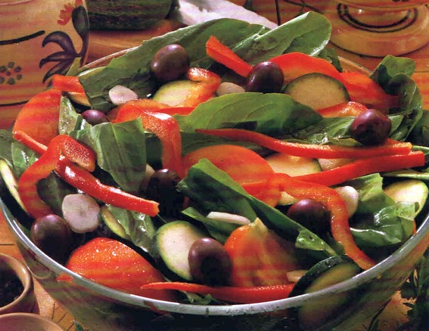 Riunite il tutto in un’insalatiera, aggiungete le olive sgocciolate e condite con la salsa precedentemente preparata.